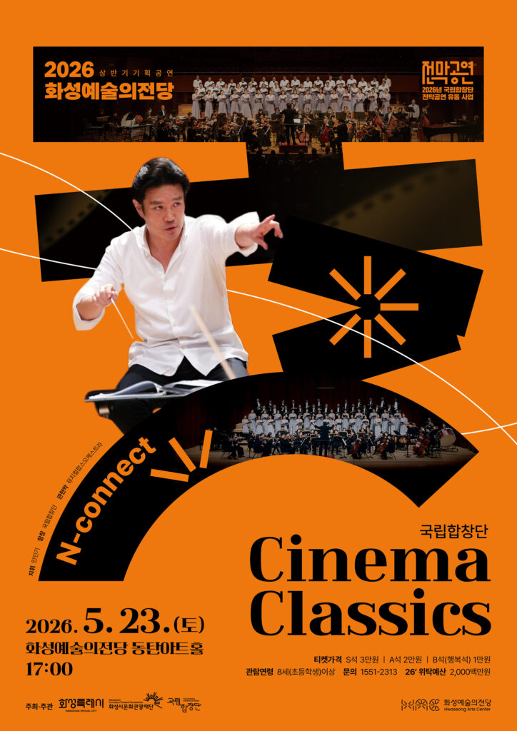 국립합창단 <Cinema Classics> 공연명 국립합창단 <Cinema Classics> 공연일시 2026.05.23.(토) 17:00 공연장소 화성예술의전당 동탄아트홀장 주최 국립합창단, 화성특례시, 화성시문화관광재단 티켓가격 S석 3만원 / A석 2만원 / B석(행복석) 1만원 문의 화성예술의전당 1551-2313 사진 영상