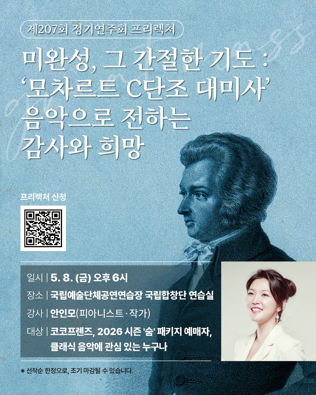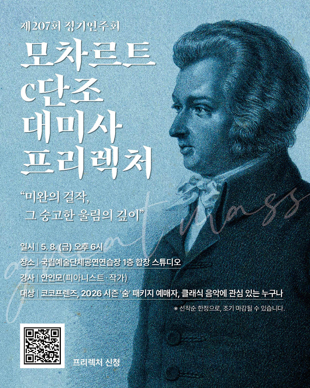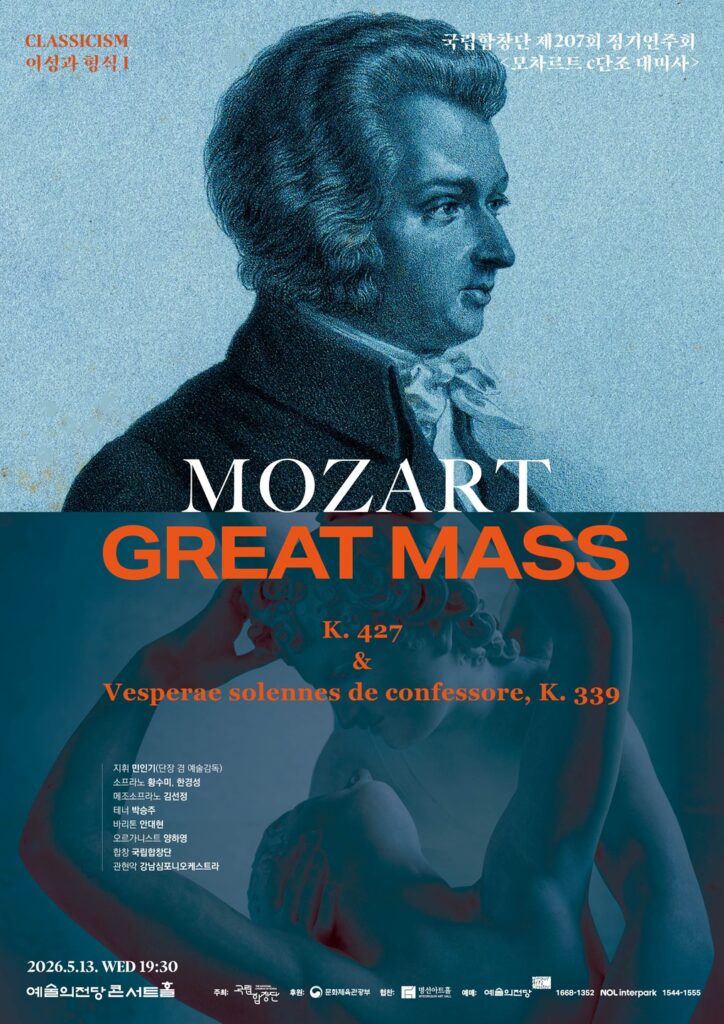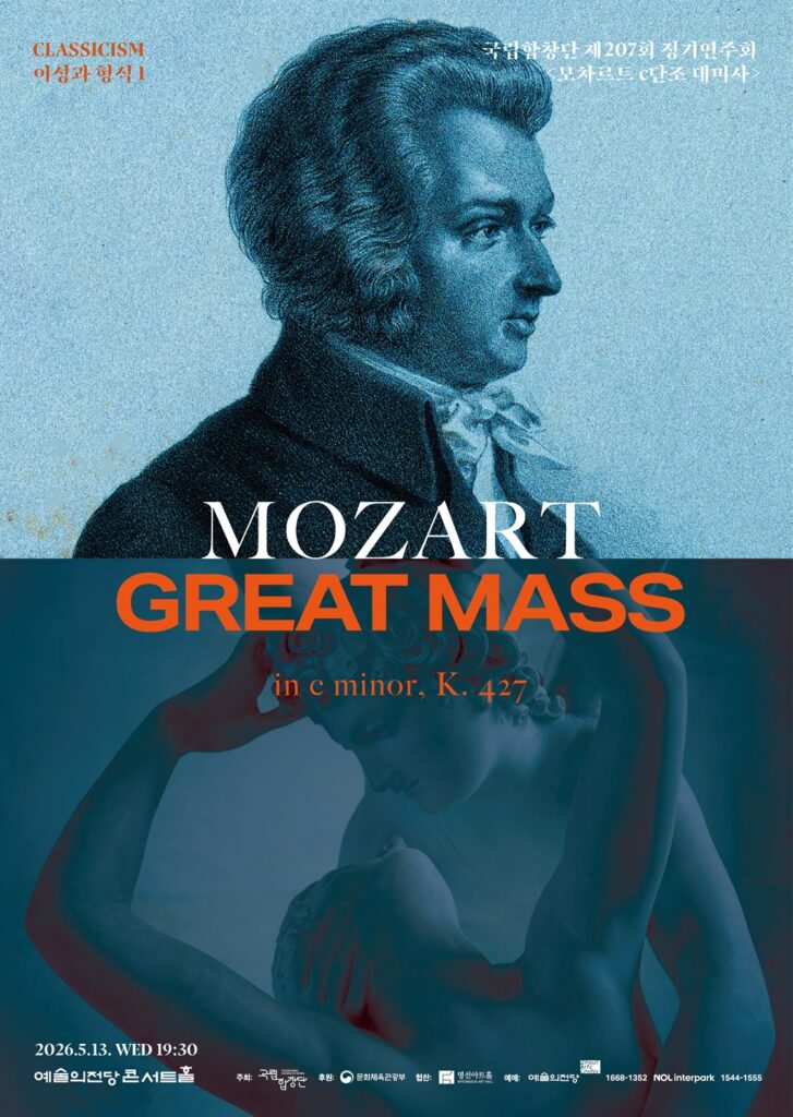 제207회 정기연주회 <모차르트 c단조 대미사> 공연명 제207회 정기연주회 <모차르트 c단조 대미사> 일시 2026.5.13.(수) 19:30 티켓 R석 7만원 S석 5만원 A석 3만원 공연장소 예술의전당 콘서트홀 예술의전당 예매 NOL 티켓 예매 프리렉처 신청하기 https://forms.gle/8fVSyncYMxe9DAWk7 사진 영상